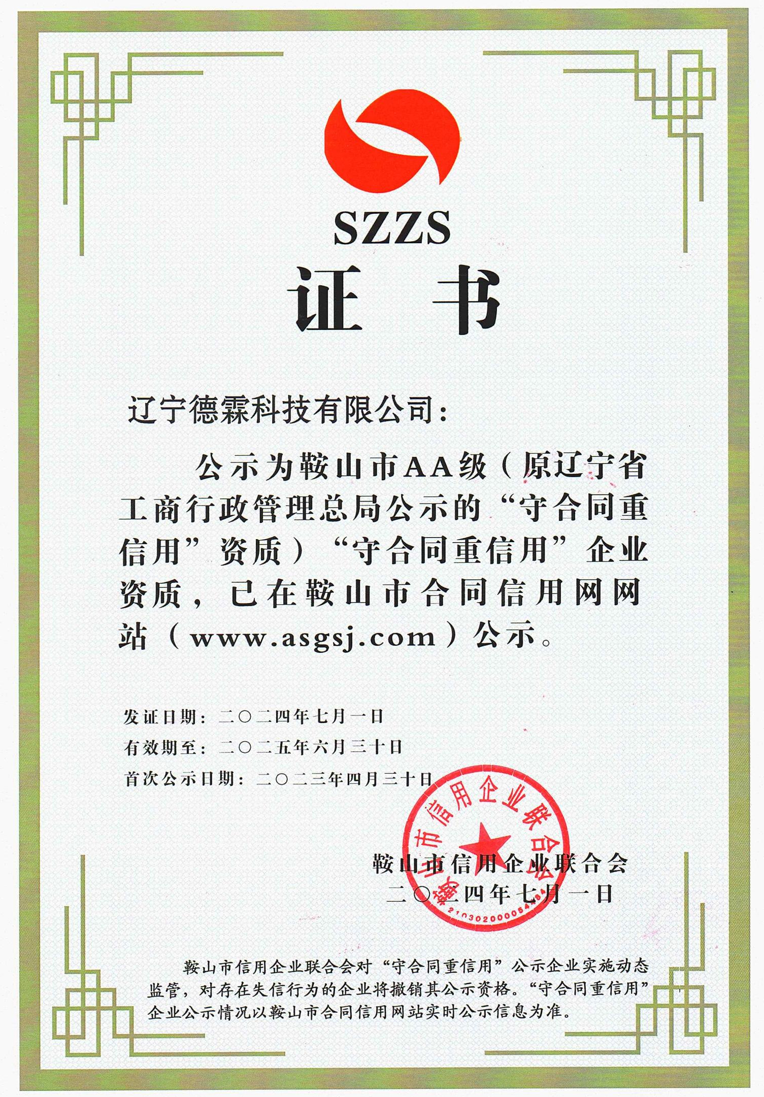 公司取得了鞍山市AA級(jí)”守合同重信用“企業(yè)資質(zhì)