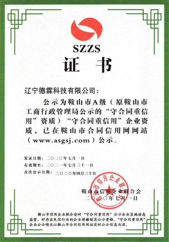 公司取得了鞍山市A級(jí)”守合同重信用“企業(yè)資質(zhì)